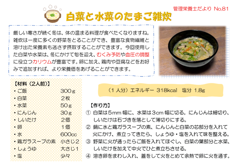 管理栄養士だよりNo.81「白菜と水菜のたまご雑炊」を掲載しました