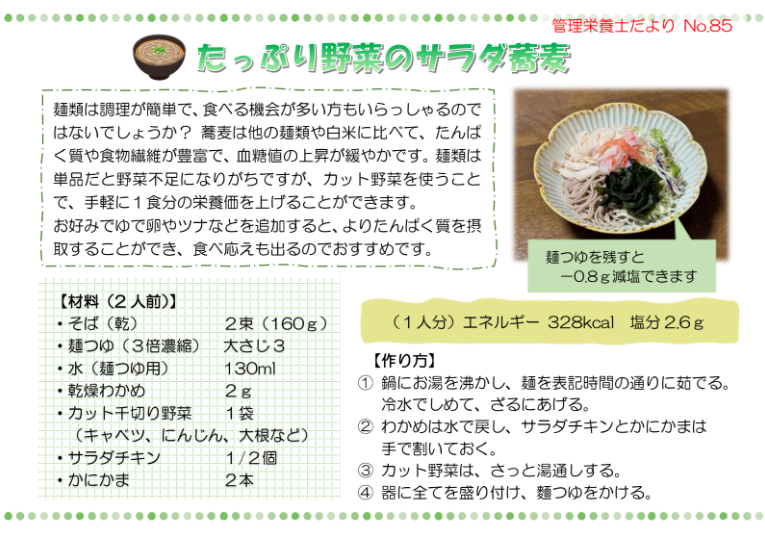 管理栄養士だよりNo.85「たっぷり野菜のサラダ蕎麦」を掲載しました